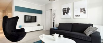 The deep blue color in the interior of the living room will have a positive effect on the psyche of people who spend time in it.
