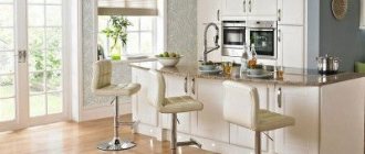 When creating the interior, it is important to keep the kitchen furnishings in the same style. Therefore, after installing the bar counter, you need to purchase chairs of the appropriate shape. Advantages of the models: stylish appearance, reliability, varied design. Disadvantages include the heavy weight and fragility of products with plastic seats.