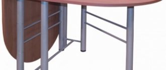 Tables with a book mechanism can be equipped with additional internal drawers for storing kitchen utensils or a device for storing folding chairs. It is noteworthy that such tables with one raised side are perfectly installed against walls. The price of models is determined by size, quality of material and ranges from 2,000 rubles to 9,000 rubles.