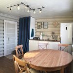 Цветовое решение – простое и современное. Белые фасады кухонного гарнитура и столешница с принтом «под дерево» отлично комбинируются со стульями Икеа, имеющими те же мотивы. Свет от подвесного светильника на гнущихся ножках над столом можно по необходимости перемещать по комнате. Сам дизайн скорее можно назвать скандинавским и современным одновременно.