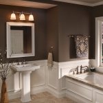 . От темных красок, которые свойственны таким функциональным зонам, стоит отказаться из-за темного ореха. Декораций здесь следует использовать по минимуму.