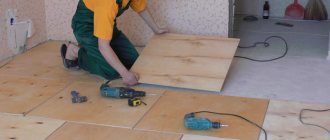 Этот способ называют часто «паркетным», так как процесс укладки половых досок здесь аналогичный процессу укладки обычного паркета. Отличие лишь в том, что половые доски, по причине их значительной толщины, дополнительно закрепляются саморезами.